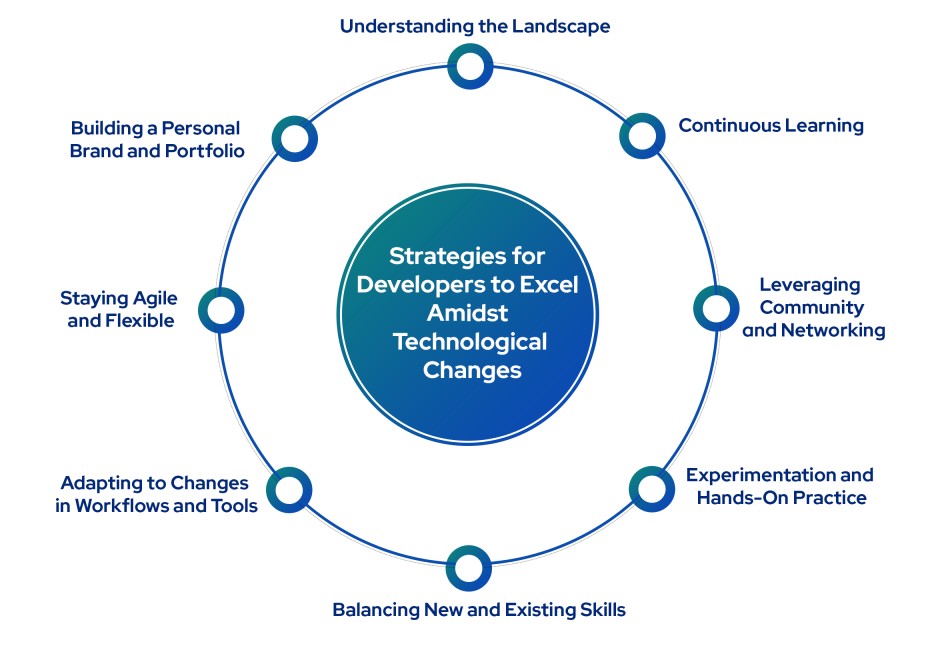 This image illustrates the key strategies for developers to excel amidst technological changes. Moving forward, we consider how each of these strategies should work and discuss some ideas about staying ahead in an evolving world.