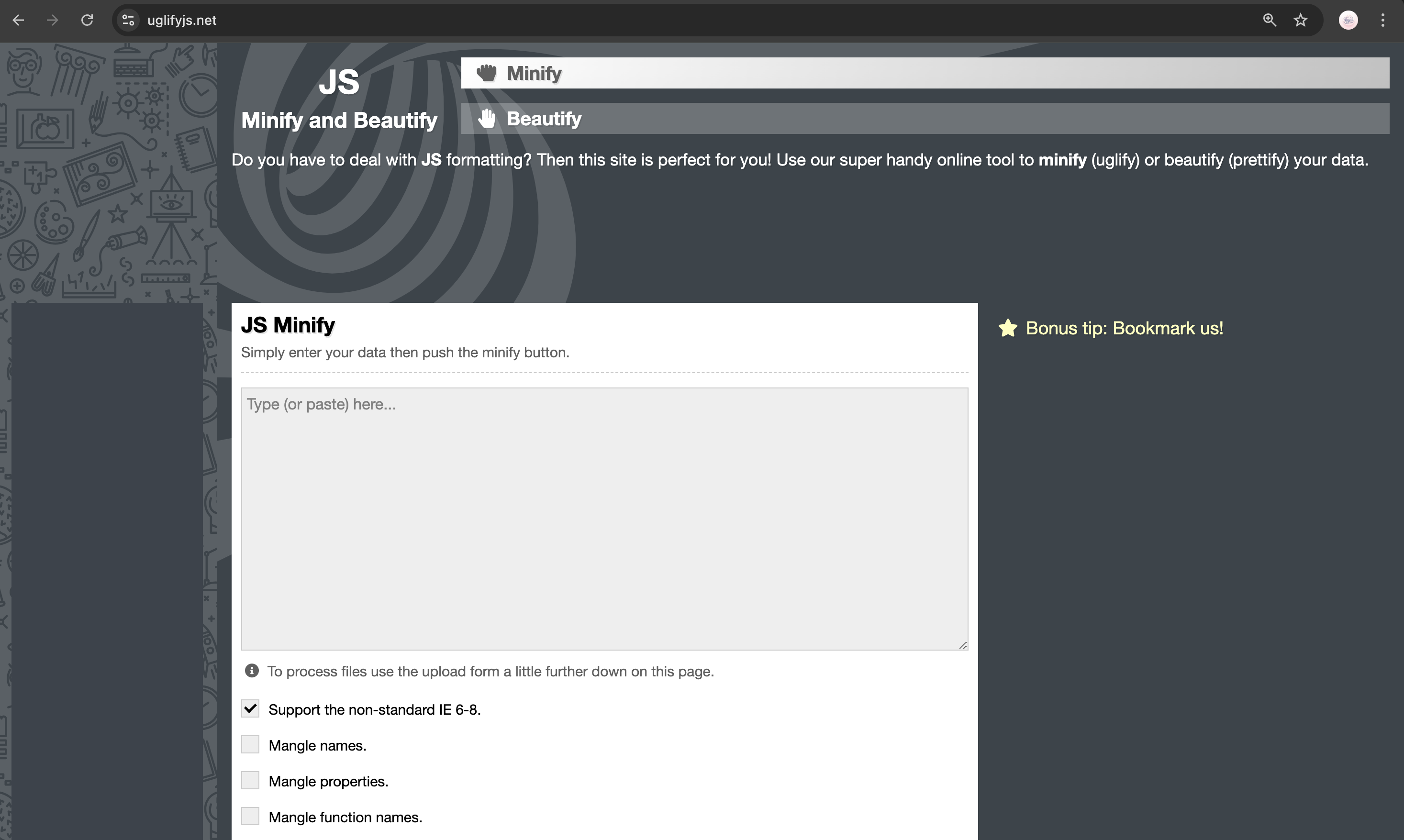 UglifyJS is one of the very first minification tools for JavaScript. It is a complete toolkit for JavaScript parsing, minification, compression, and beautification of the source code. UglifyJS supports ES5 syntax, which allows using it with both older projects and those that do not require new modern features of JavaScript.
